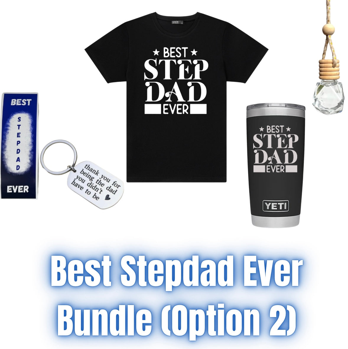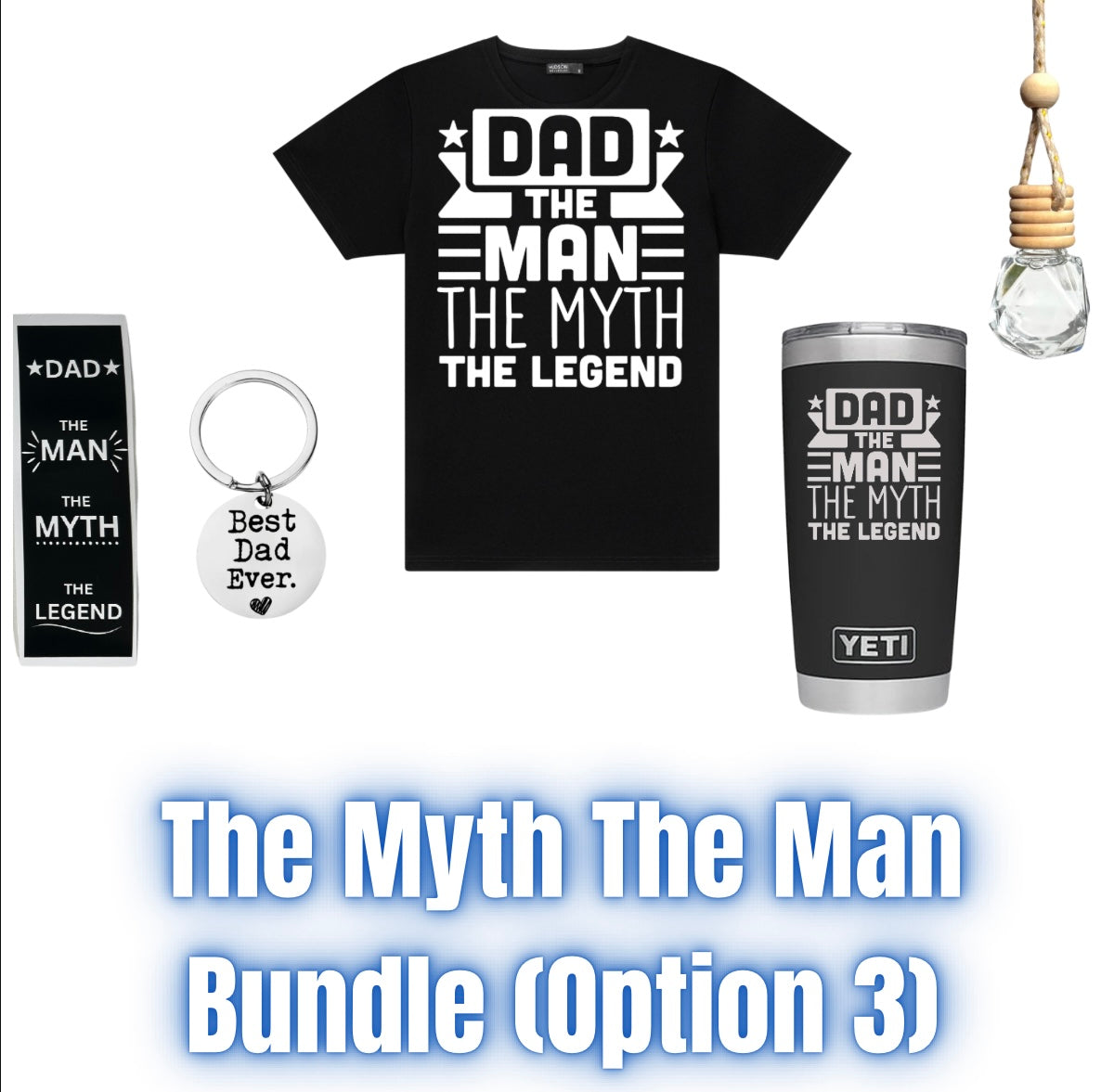 In your Father’s Day bundle you will receive the following: Engraved Yeti, T-Shirt, Diffuser, Pen, and a Keychain. You will get to choose which print out of 3 that you’d like on the Yeti & T-Shirt